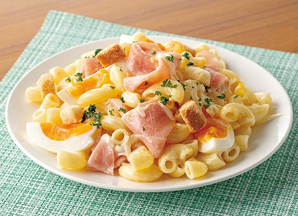 5. マカロニ・たまご・生ハムをボウルに入れ、?Bを加えさっと和える。クルトンとパセリをちらす。