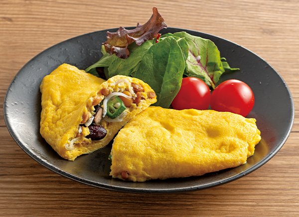 4. 2を卵の中心にのせ、手前から卵で包みオムレツにする。