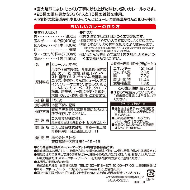 直火焙煎により、じっくり炒り上げた味わい深いカレールゥです。25種類の風味豊かなスパイスと15種の雑穀を使用し、香り高いスパイスと爽やかな辛さが特長です。北海道産小麦を100%使用しています。