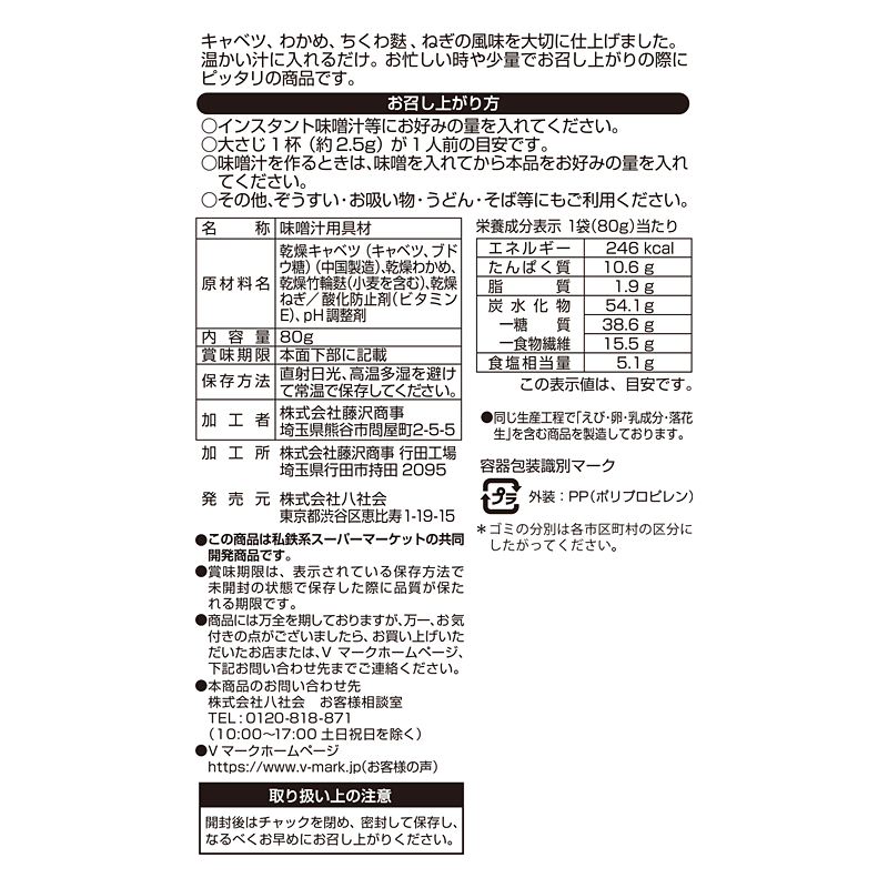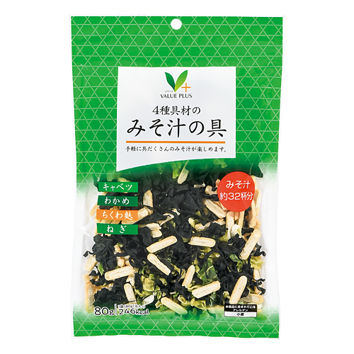 キャベツ・わかめ・ちくわ麩・ねぎが入った味噌汁の具です。少量食べたい時や、忙しい時に具材を入れるだけでお召し上がりいただけます。カットする手間がはぶけます。