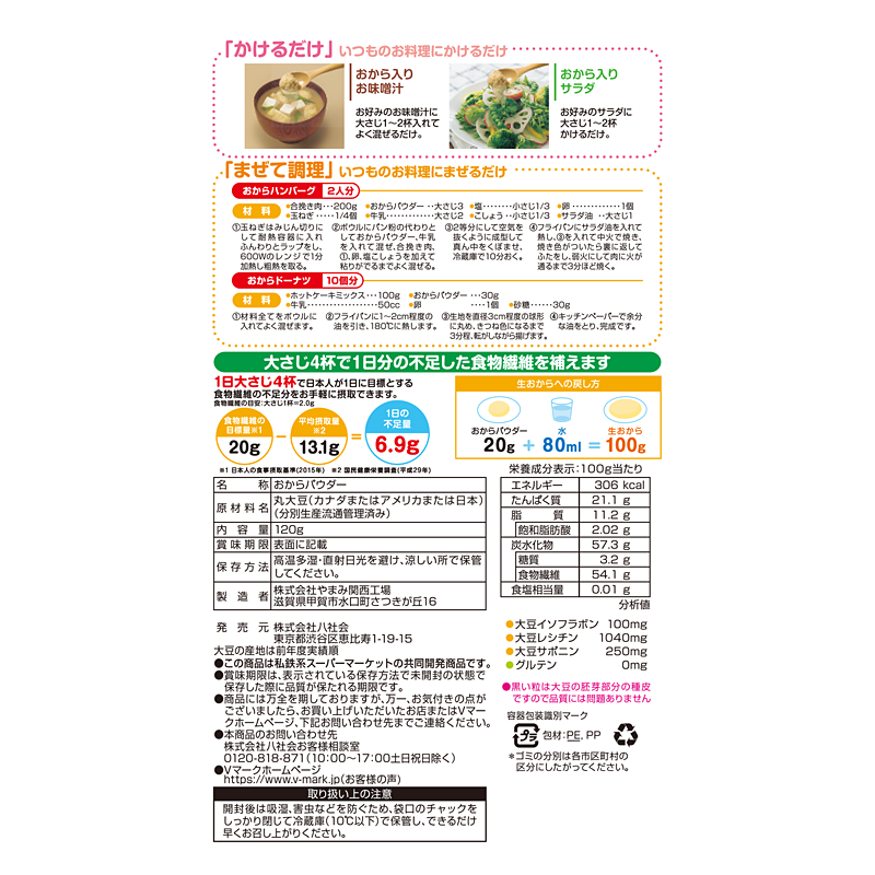 豆腐由来のおからから作った食物繊維と植物性たんぱく質を豊富に含んだおからパウダーです。様々なレシピで簡単に食物繊維が摂取出来ます。