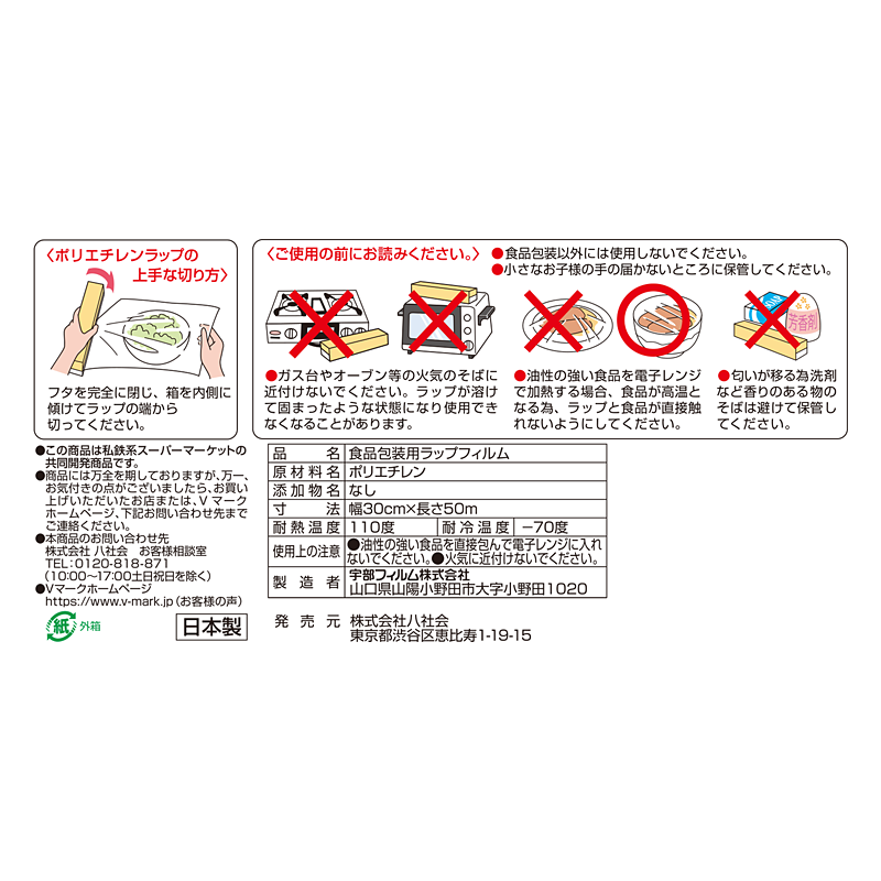 粘着付与剤等の添加物を一切使用していない無添加食品用ラップです。フィルムは使って安心な非塩素系素材で、野菜や果物の呼吸を妨げず、環境にやさしい素材。