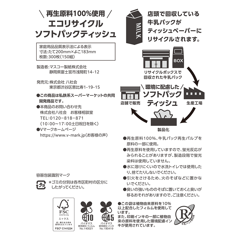 店頭で回収している牛乳パックがティッシュペーパーにリサイクルされます。紙ボックスタイプよりコンパクトで持ち運びに便利、使用後も小さくまとめられるので楽に捨てられます。