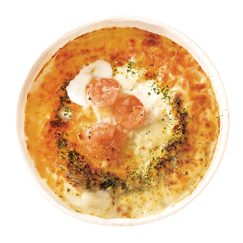 海老のぷりぶり食感と、とろーりチーズとクリーミィなベシャメルソースが特長のボリューム感あるグラタンです。