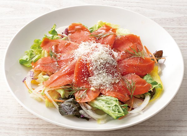 スモークサーモンスライス 又は 生ハム切り落とし 50gレタスとオニオン10品目サラダ 又は ベビーリーフ 1/2パックオリーブオイル 大さじ1レモン汁 大さじ1塩 少々黒こしょう 少々パルメザンチーズ 大さじ1ディル 適量