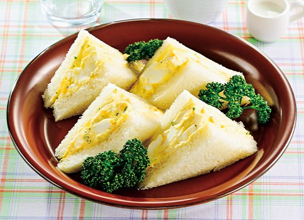 4. パンに具材をはさみ、全体にラップを巻き、しばらく休ませたら、食べやすい大きさにカットし、器に盛り付ける。
