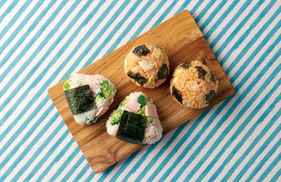 3. ごはんに2・[B] を加えて混ぜ、2等分にしてラップで包み山型に握り、のりを巻く。