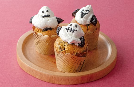 5. マフィンの粗熱が取れたら、ホイップクリーム・1/4に切ったプルーンでおばけの形をつくり、チョコレートペンで作った顔を貼りつける。