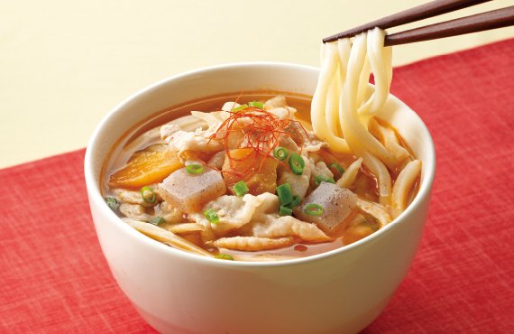 4. つゆを3~6分煮詰めたら、うどんを器に盛り付け、具材をのせてつゆをかける。