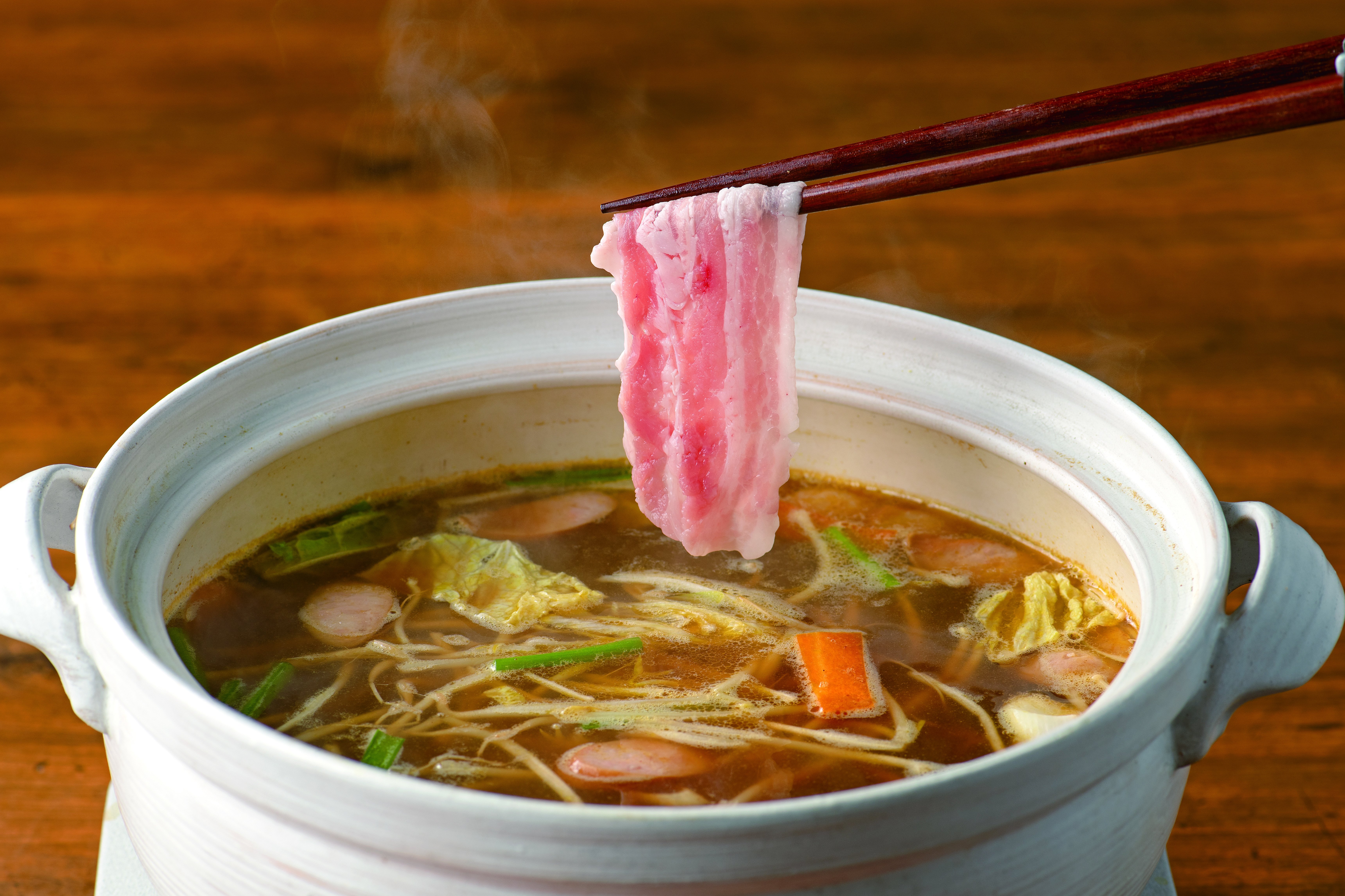 3. 鍋つゆが煮立ったら、ウインナー・野菜セット・もやしを加え、豚肉をしゃぶしゃぶする。