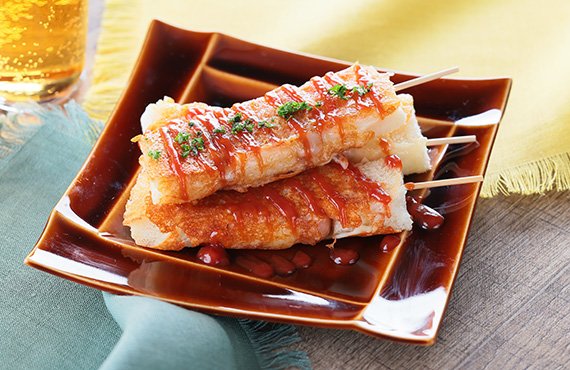 おやつにもぴったりな韓国グルメ。食パンとウインナーを串に刺してたっぷりのバターで焼き、ピザ用チーズを巻きつけます。ホットドックのような、大人も子どもも夢中になるおいしさです。