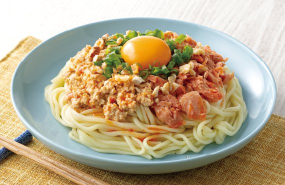 4. 器に麺を盛り付け、2のそぼろ・鮭ほぐし・卵黄・砕いたナッツ・きざみねぎをのせる。