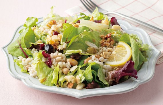 3. 器にお好みのサラダを盛り付け、サラダ豆・1でゆでたもち麦・ナッツをのせる。