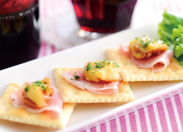クラッカーの上に、生ハム、スモークチーズをトッピングしました。スモークチーズは加熱することにより風味が増します。ワインにも合う1品。おつまみにおすすめです。