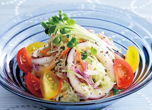 旬のイカとキャベツと合わせてマリネ風サラダに仕上げました。イカは脂質が少ないのでとてもヘルシー。おつまみにもおすすめです。彩り良く、春の訪れを感じるメニューです。