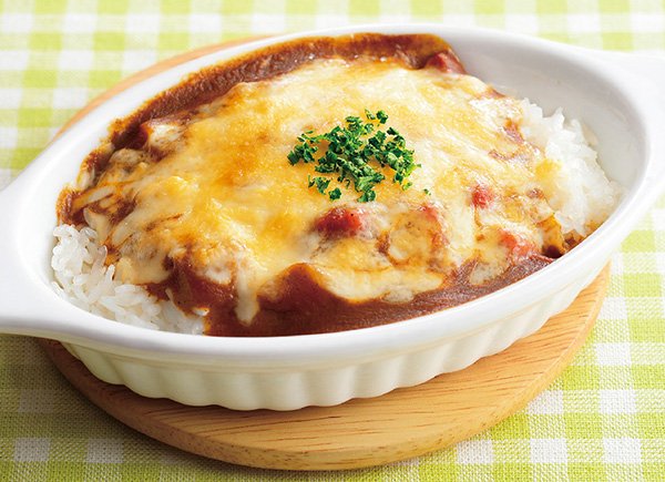 2. 耐熱容器に温めたごはんを入れ、その上に冷たいままのビーフカレー(レトルトパック)をかけ、チーズをのせる。