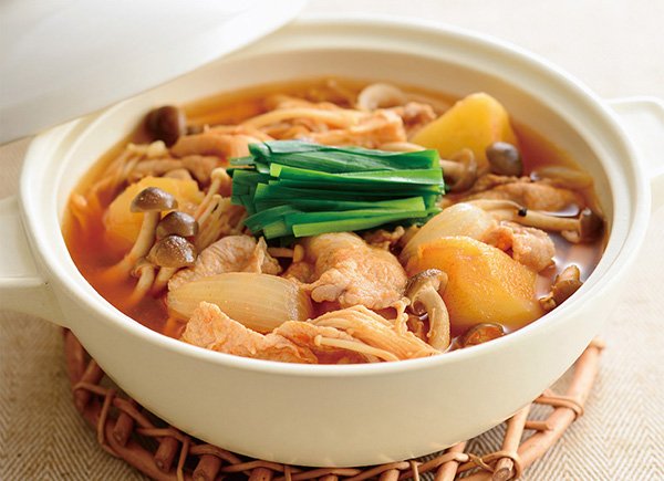 キムチ鍋つゆを使用したホットメニュー。ごろごろと大きめに切ったじゃがいもに、玉ねぎ、豚肉を合わせました。