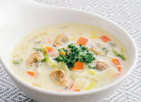 あさりの水煮缶を使ったクリーム系のスープ。 白菜の甘みとあさりの旨みが合わさったホットメニューです。