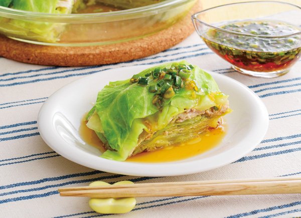 ※作り方のポイント:キャベツ、豚肉の順に何度か重ね、最後はキャベツになるようにします。隙間なく、しっかり押さえながら重ねていきましょう。