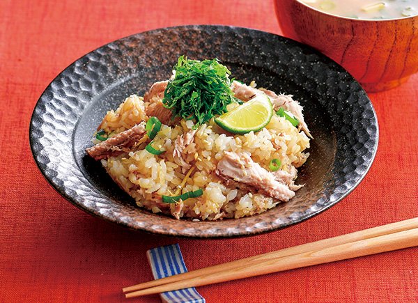 4. 1のご飯が炊けたら生姜、青ねぎ、いりごま、3のさんまを加え、さっくりと混ぜ合わせる。器に盛り付け、大葉とすだちを添える。
