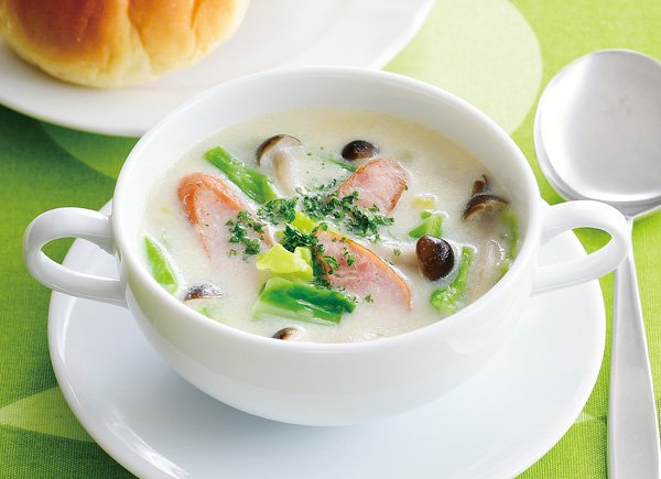 2. 鍋を温めバターを溶かし、玉ねぎ、ウインナーソーセージを加え炒める。しんなりしてきたらキャベツとしめじを加え、全体がしんなりしたら小麦粉を全体に絡ませるように加えて炒める。そこへ分量の水と固形スープを加える。