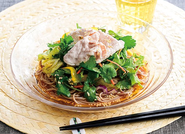 4. 茹でたそばを皿に盛り付け、パクチーサラダ、2を盛り、3のつゆをかける。