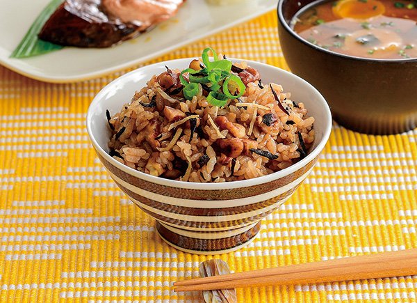 4. 炊飯器に米、水、醤油、塩を入れ、ひと混ぜし、水気を切った芽ひじきとクルミをのせ炊飯する。