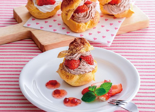 7. シューが冷めたら、下から約2/3のところでカットし、6をのせ、シューで蓋をし、茶こしでピュアココア又は粉砂糖をふる。