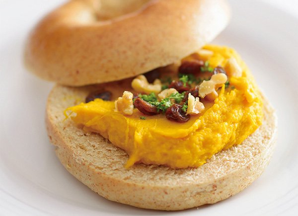 かぼちゃにクリームチーズ、メープルシロップを加え甘めに仕上げたパンプキンサラダです。レーズン、クルミをトッピングすることにより味と風味にアクセントをプラスします。