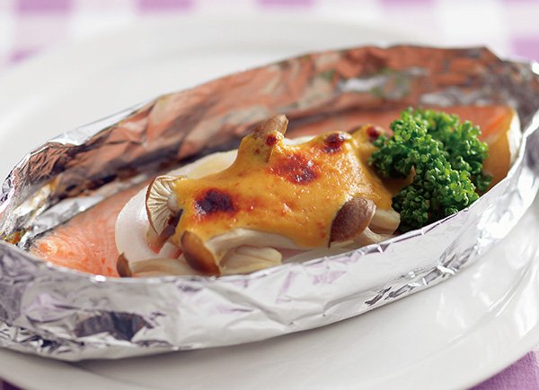 秋鮭に、玉ねぎ、しめじ、味噌マヨネーズをのせてホイル焼きにしました。みそとマヨネーズの相性が良く、食が進む1品です。