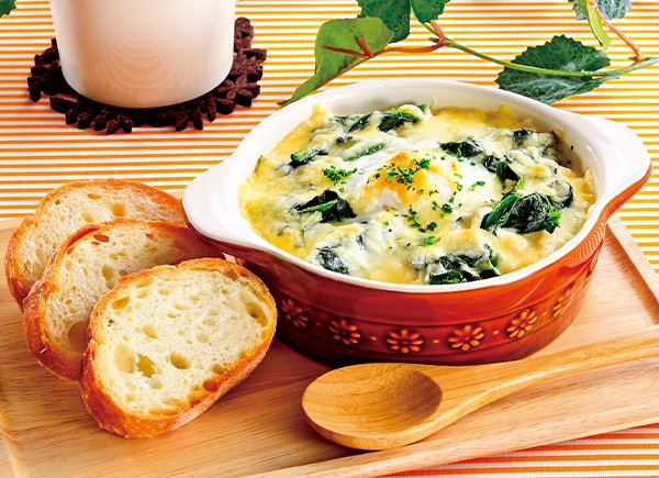 3. 耐熱容器に、2、ほうれん草を入れ、中央をくぼませて温泉たまごを割り入れ、ミックスチーズをのせる。