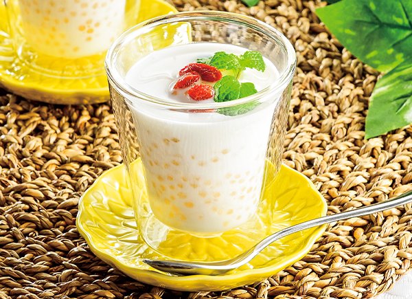 4. 3に茹であがったタピオカを加える。器に盛り付け、クコの実とミントの葉を飾る。