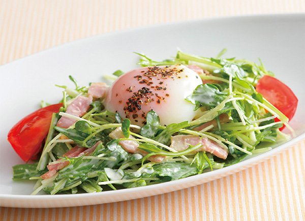水菜とかいわれ大根を合わせ、自家製シーザーサラダ風のドレッシングで和え、温泉たまごをのせ仕上げます。ヨーグルトを使い、カロリー控えめのさっぱりヘルシードレッシングです。